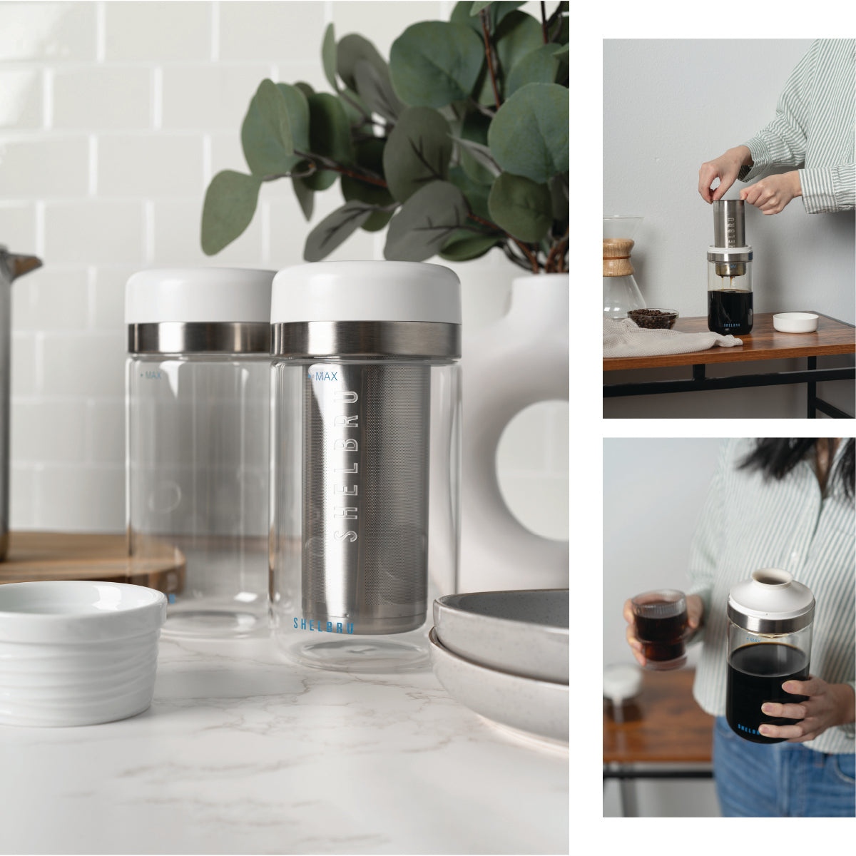 Our innovative 2-piece set allows you to use one jar to store and serve while the other jar makes another batch. When you’re done brewing, simply swap the filter with the spout to turn the Brewer into the Carafe. No more waiting in between batches!