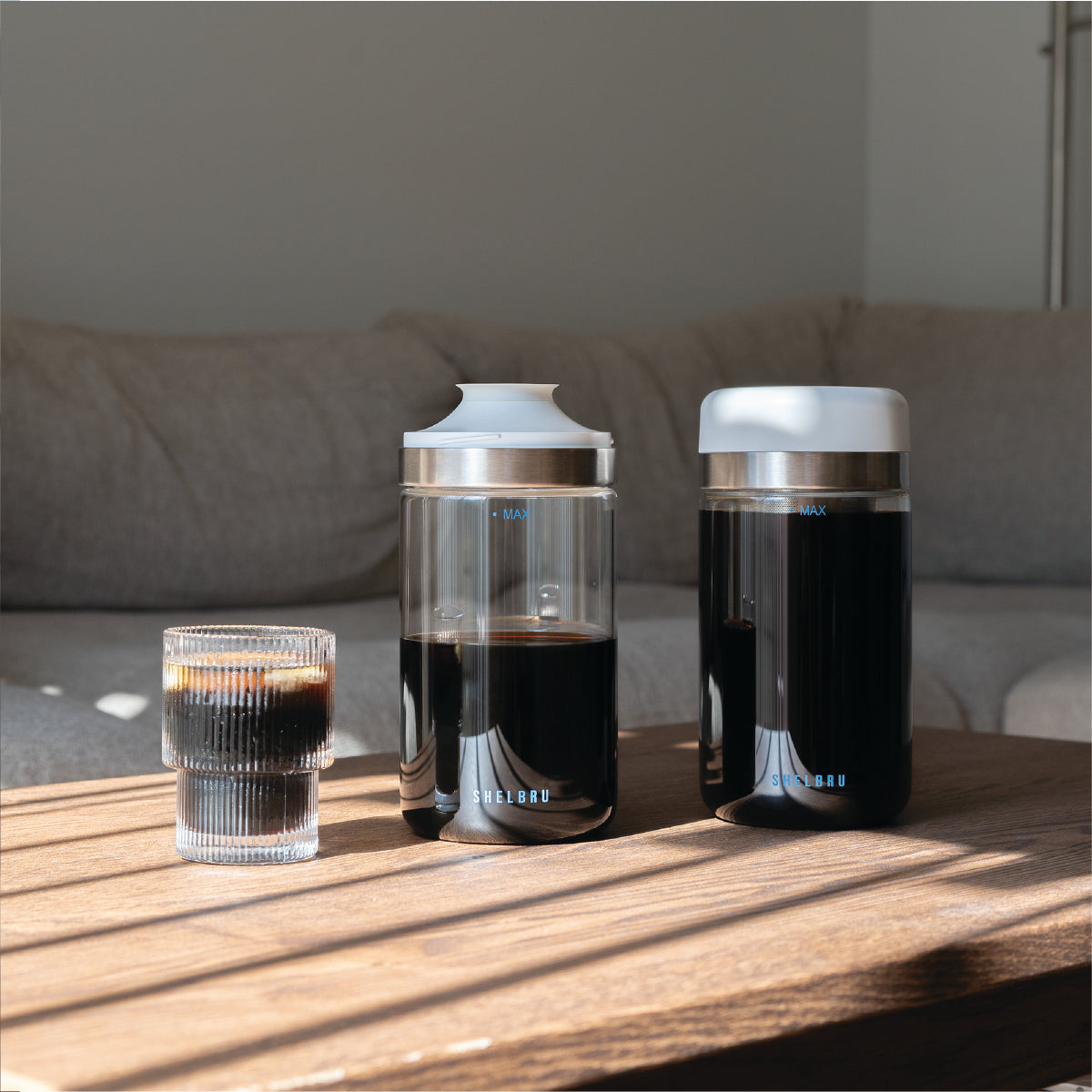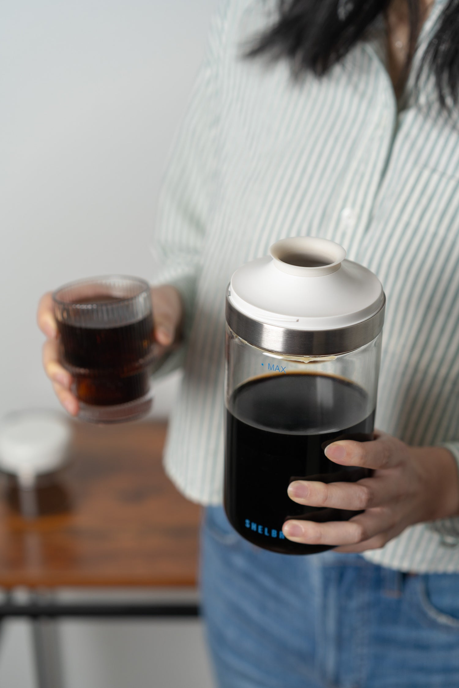 Add 100g (3.5oz) of coffee to the coffee filter (there is a 3.5oz mark on the surface of the filter) and add 700ml of water to the jar, or fill the water up to the “MAX” mark on the glass jar to produce 500~550g of cold brew concentrate.